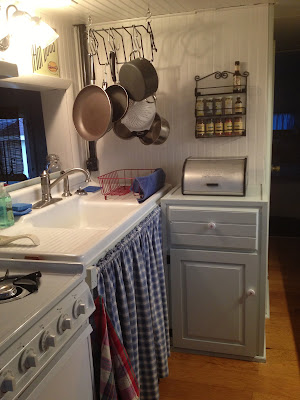 Doug fashioned a pot rack out of a roasting rack, and he built a small cabinet out of scrap wood. We also covered all of the walls and the ceiling with bead board, and Doug installed a new wood laminate floor.